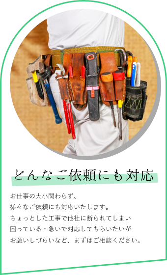 ちょっとした工事で他社に断られてしまい困っている・急いで対応してもらいたいがお願いしづらいなど、まずはご相談ください。